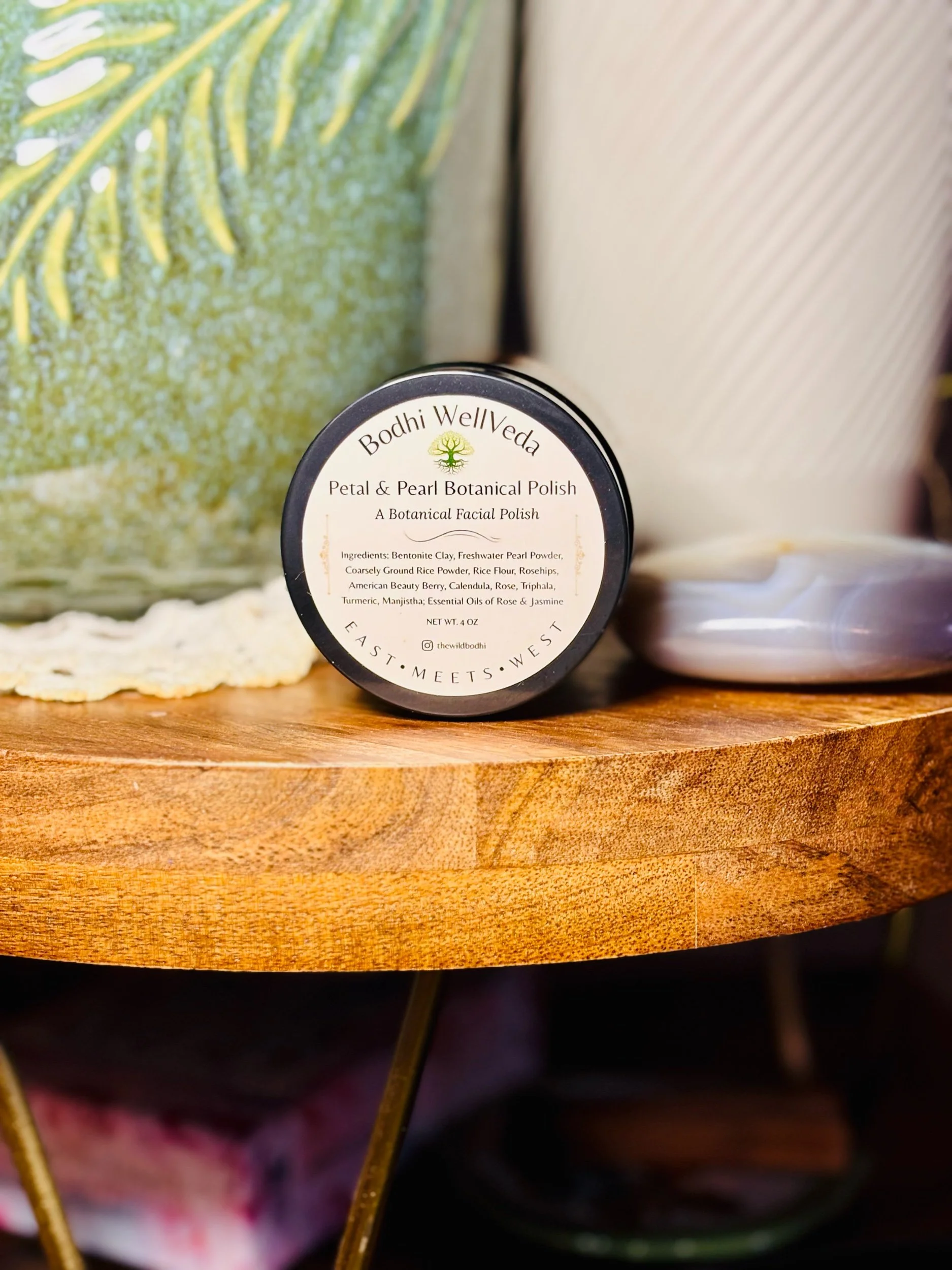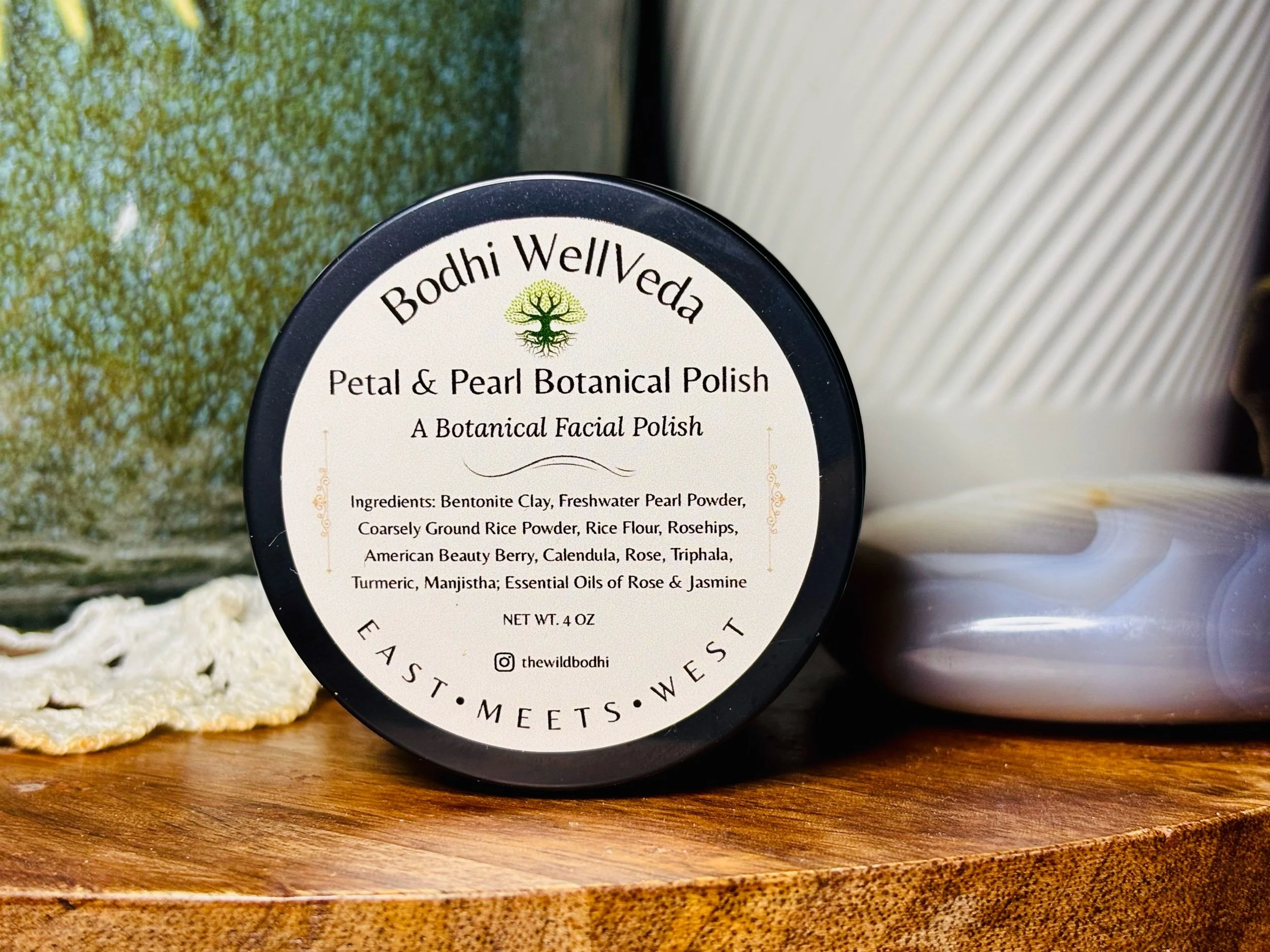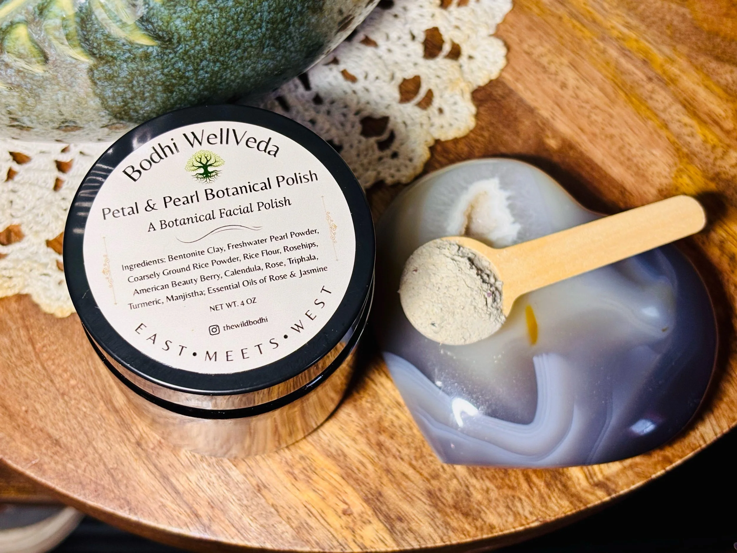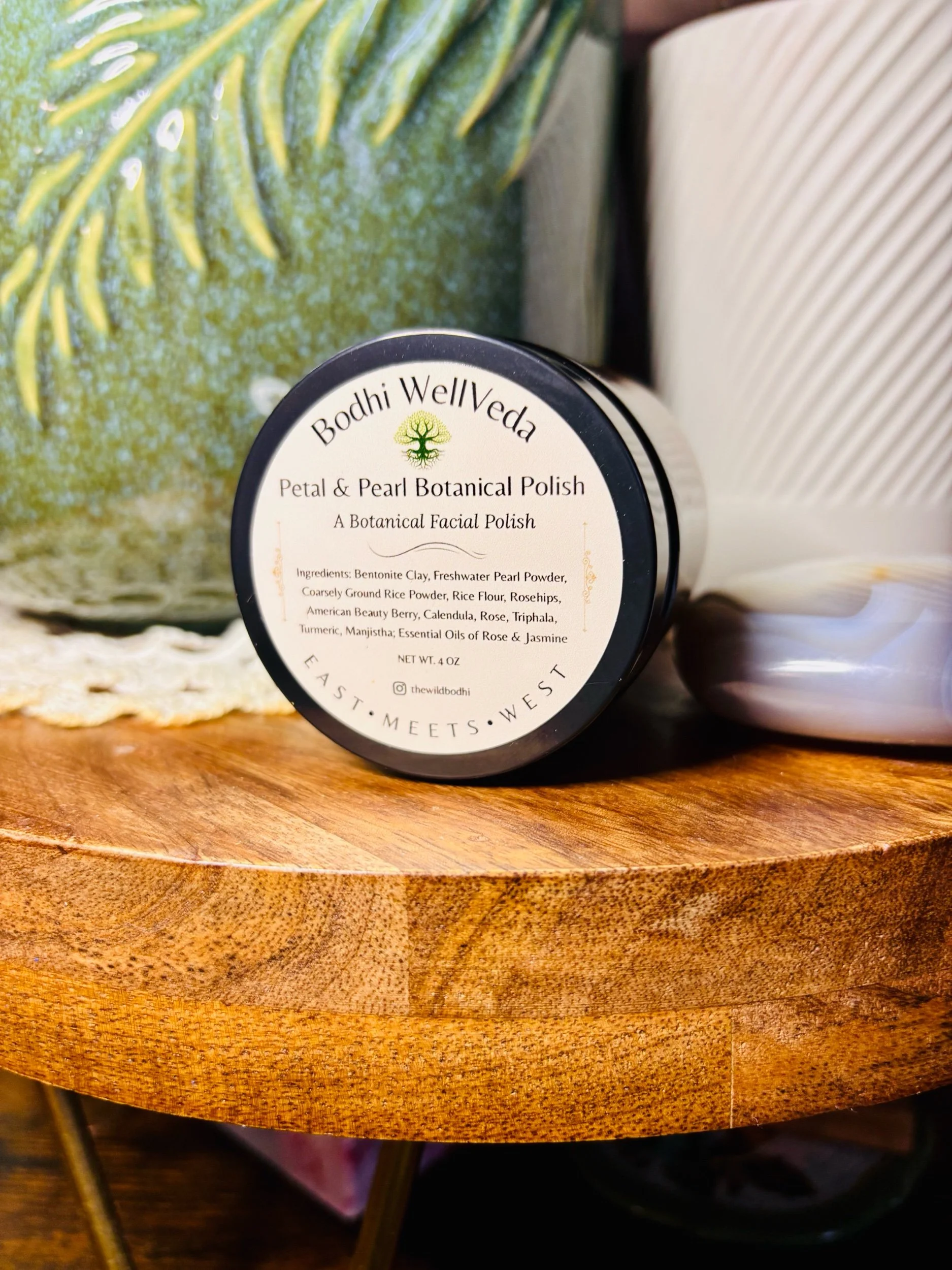Petal & Pearl Botanical Polish is a dry facial polish made with a thoughtful blend of clays, powders, botanicals, and petals for a gentle, ritual-worthy exfoliation experience.