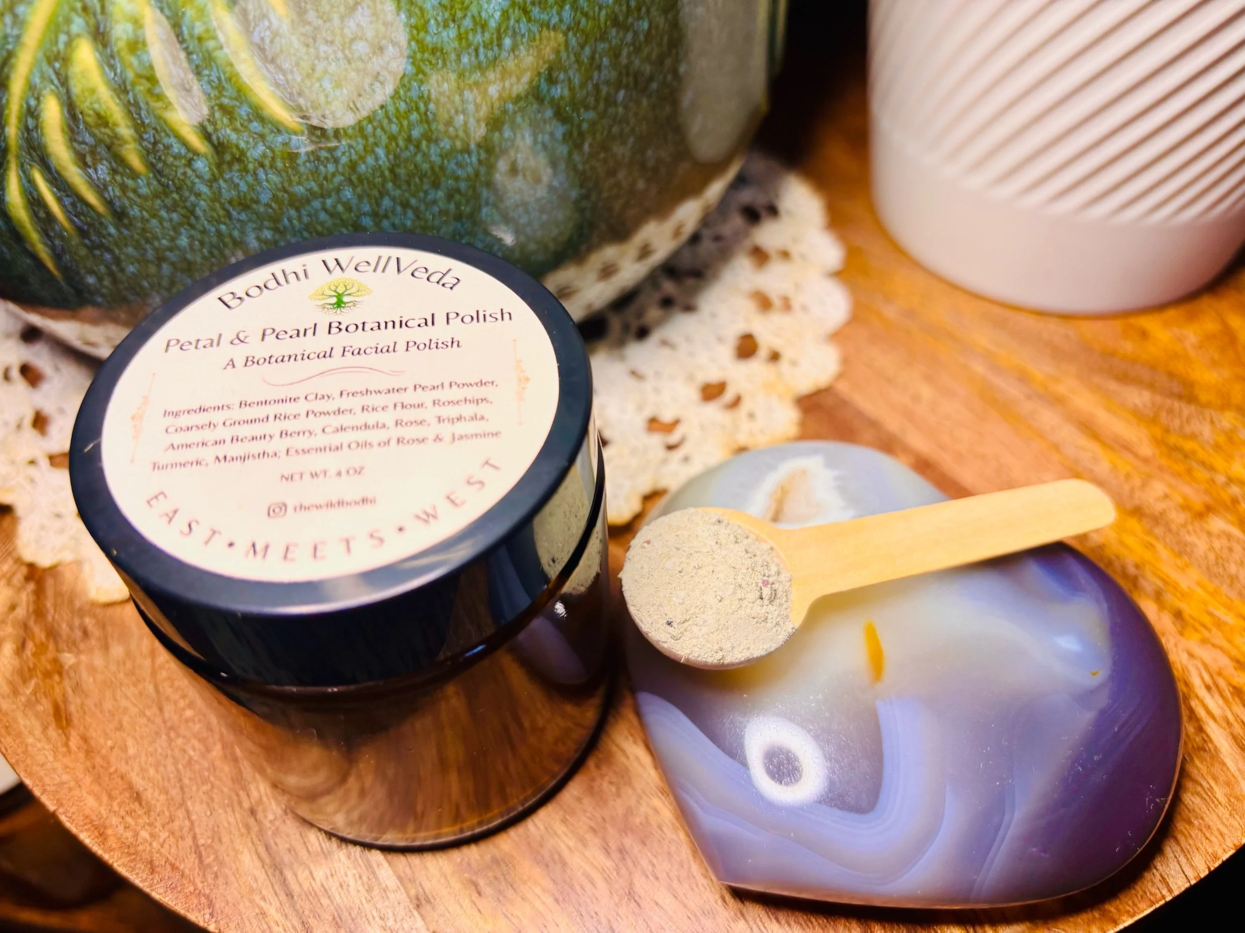 A dry botanical facial polish made with clay, pearl powder, rice powders, and flower-forward plant ingredients to gently buff, soften, and refresh the skin.